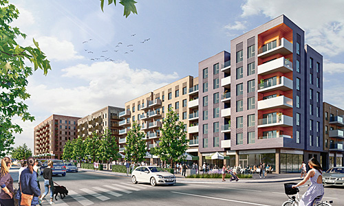 The design includes landscaped podia, concealed parking courts and M4(3) and M4(2) homes, with the units now meeting Nationally Described Space Standards